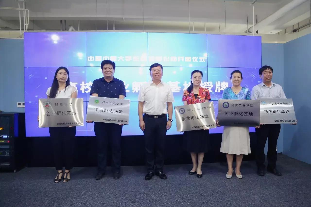 ▲ 河南省人社廳廳長劉世偉(左三)為首批5家高校創(chuàng)業(yè)孵化基地代表授牌