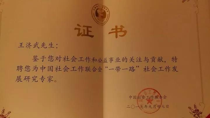 ▲ 王濟(jì)武董事長(zhǎng)被聘為“一帶一路”社會(huì)工作發(fā)展研究專(zhuān)家