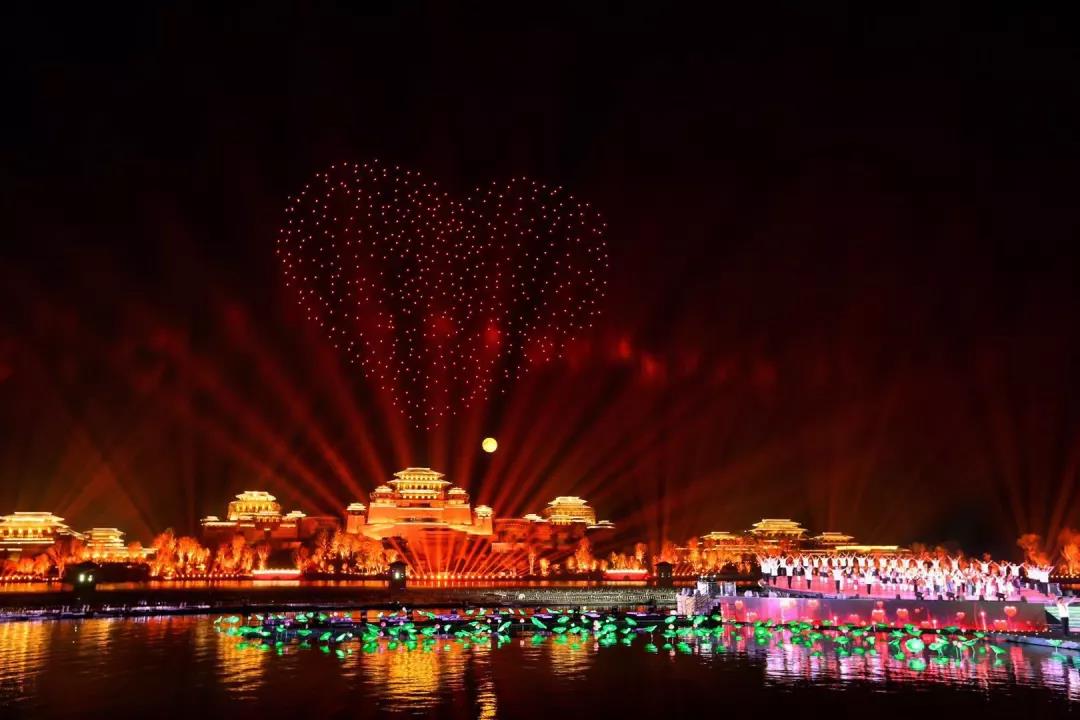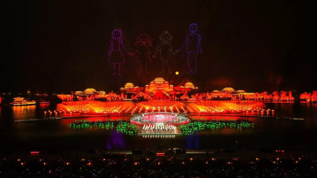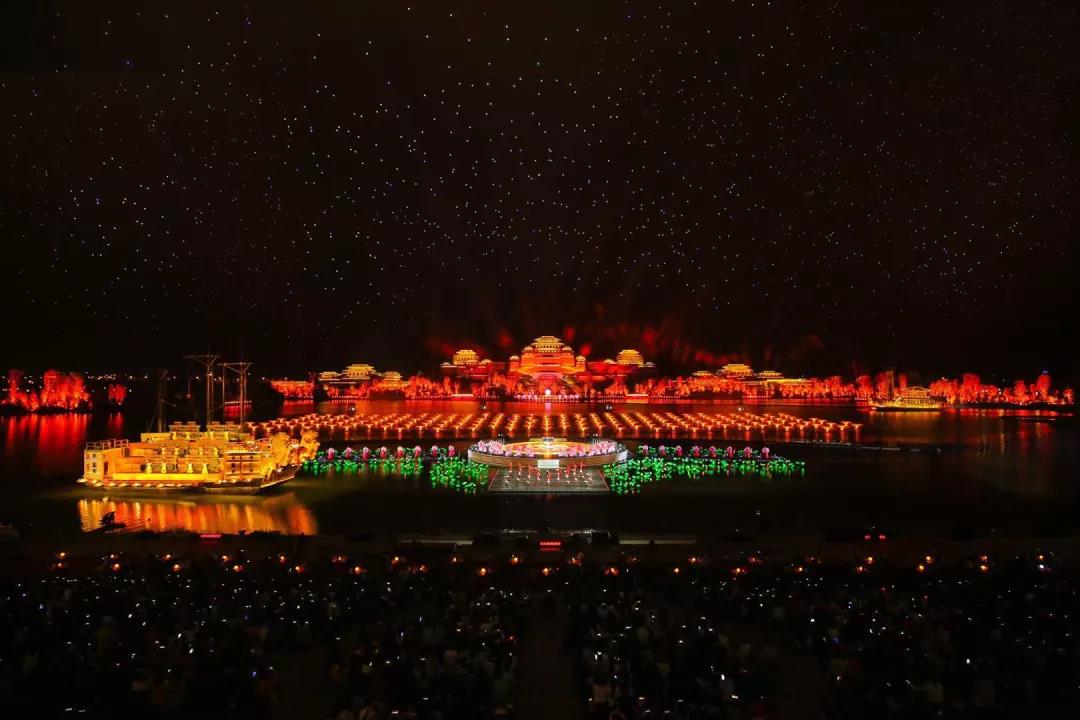 全舞美設(shè)施是由奧運(yùn)、亞運(yùn)、世博、APEC、G20峰會(huì)表演總制作人沙曉嵐團(tuán)隊(duì)傾力打造。明月、繁星、湖景、樹木等自然生態(tài)元素與燈光相結(jié)合,繪制出一幅月落平湖、秋水長天的漢風(fēng)秋畫。