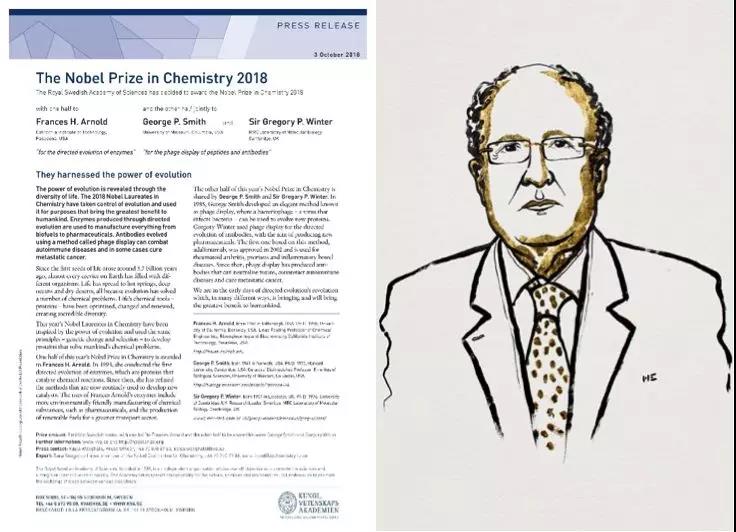 ▲瑞典皇家科學(xué)院官方宣布本年度諾貝爾化學(xué)獎(jiǎng)歸屬,右圖為劍橋大學(xué)三一學(xué)院院長(zhǎng)Sir Gregory Winter漫畫(huà)肖像