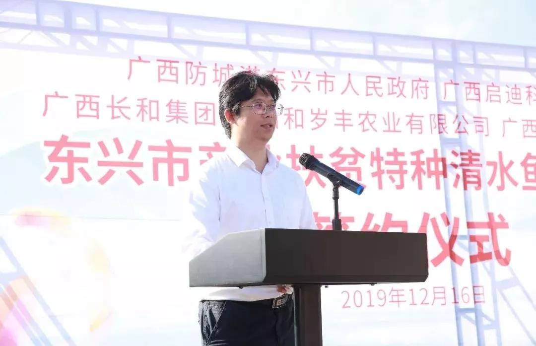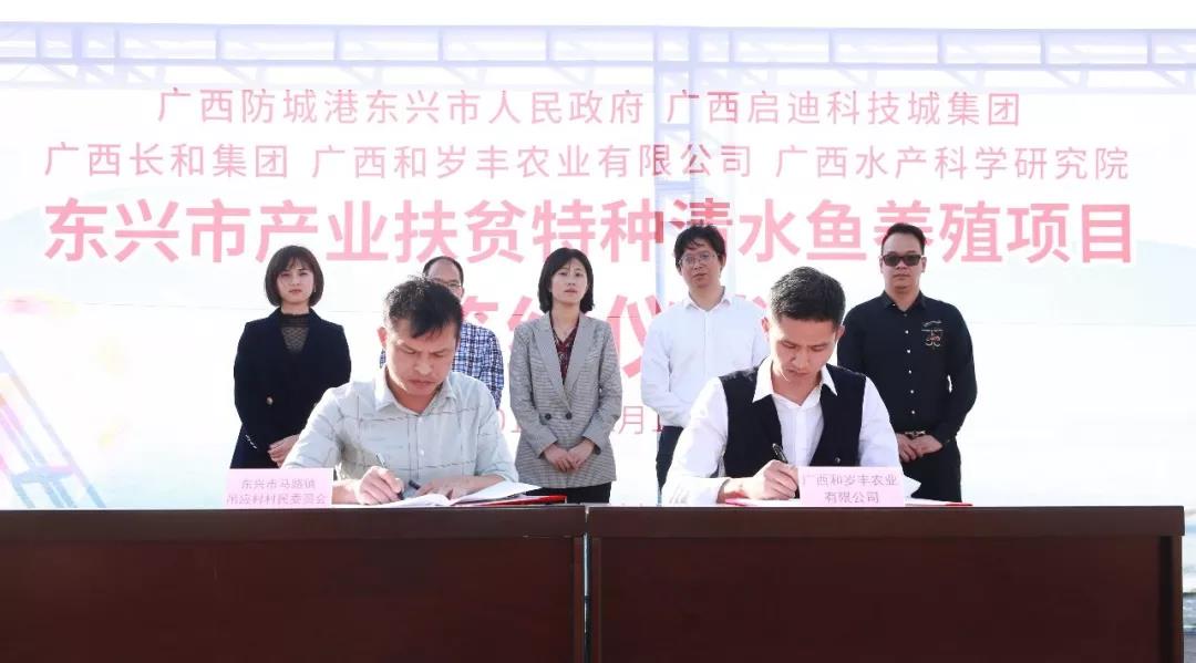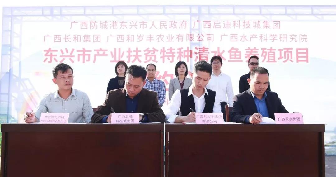 為發(fā)展好廣西東興市“3+1”特色產業(yè)體系,提升貧困群眾的內生動力,全力打贏脫貧攻堅戰(zhàn),加快助力東興市產業(yè)扶貧特種清水魚項目養(yǎng)殖發(fā)展,減輕農戶養(yǎng)殖成本,降低魚類養(yǎng)殖風險,助力貧困戶脫貧致富,開拓農產品銷路、打造特色農業(yè)品牌。12月16日,廣西防城港東興市人民政府、廣西啟迪科技城集團、廣西長和集團、廣西和歲豐農業(yè)有限公司和廣西水產科學研究院共同舉行了東興市產業(yè)扶貧特種清水魚養(yǎng)殖項目簽約儀式。