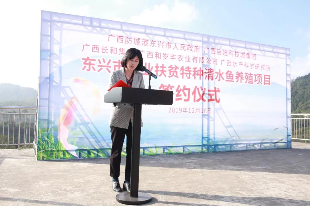 東興市委常委、東興市人民政府常務副市長黃巧玲,廣西啟迪科技城集團副總裁曾慶,科技特派員、廣西水產產業(yè)服務團團長韋信賢,廣西長和集團東興事業(yè)部總經理裴春莉和廣西和歲豐公司副總經理覃鴻毅見證簽約。