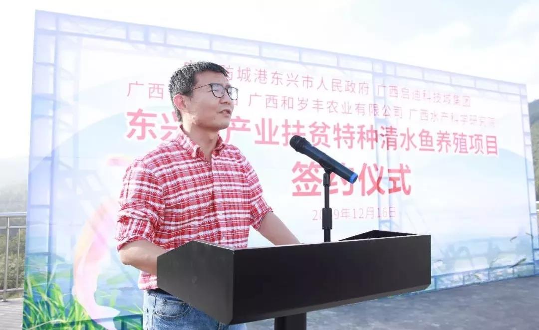 簽約儀式上,廣西水產科學研究院特色淡水魚綜合試驗基地主任肖俊對特種清水魚養(yǎng)殖項目進行了推介。