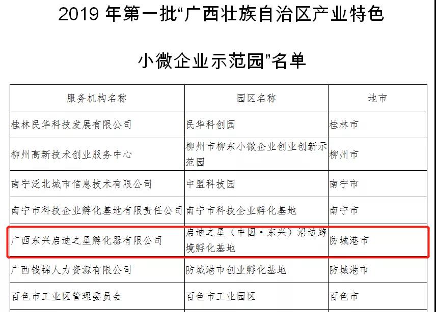 啟迪之星(中國·東興)沿邊跨境孵化基地以“跨境特色產業(yè)聚集,具有健全管理制度、完備創(chuàng)業(yè)創(chuàng)新服務流程,為入駐小微企業(yè)提供創(chuàng)業(yè)創(chuàng)新輔導、投融資、人員培訓、市場營銷、管理咨詢等多方面服務且成效明顯;運營管理等方面具有典型示范意義和推廣價值”等綜合優(yōu)勢成功入選首批“自治區(qū)產業(yè)特色小微企業(yè)示范園”。